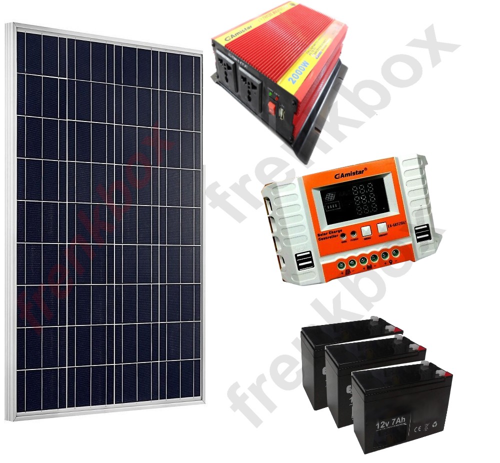 Il kit è composto da un pannello fotovoltaico multicristallino da 100 watt che grazie al regolatore di carica ad esso collegato andrà a ricaricare il pacco batterie composto da 3 batteriere da 7 amper l'una che collegate in parallelo avranno a capacità di accumulare fino a 21 amper a 12 volt. In fine un potentissimo inverter da 2000watt (1000 watt nominali utilizzabili senza problemi) che vi permetterà di trasformare i 12 volt del pacco batterie in corrente elettrica 220 volt con assorbimento massimo consigliato fino a 1000Watt .