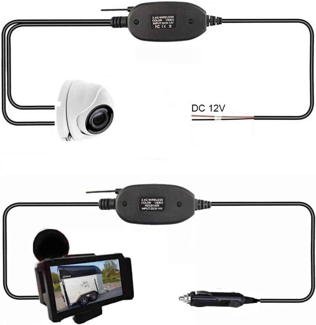 Collegamenti: Per quanto riguarda il lato del vostro veicolo, l'unica cosa che dovrete fare è agganciare la ventosa al vetro ed inserire l'adattatore nell'accendisigari. Sarete già pronti per l'utilizzo, poiché il monitor arriverà già collegato al ricevitore e all'adattatore per l'accendisigari! Mentre nel trailer, sarà necessario collegare due fili della telecamera (alla quale a sua volta è collegato il trasmettitore wireless) ad un punto di alimentazione 12 volt (come quello dove sono collegate le lampadine interne al trailer) per tenerla in funzione e farla comunicare con il monitor.