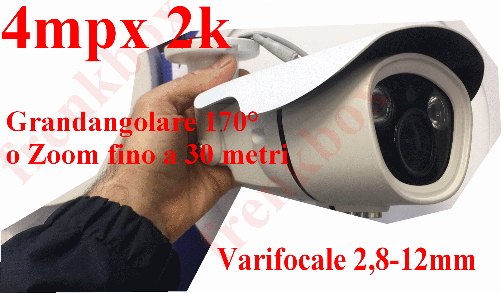 Include 8 telecamere da 4megapixel(altissima risoluzione pari a 2k!) con lente Varifocale che va da 2,8mm(per avere un inquadratura grandangolare con apertura immagine di circa 170°) fino a 12mm(per avere un inquadatura Zommata che vi permetterà di monitorare zone fino a 30 metri di distanza, giorno e notte grazie ai due potenti LED infrarossi di tipo ARRAY.)